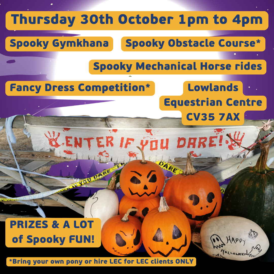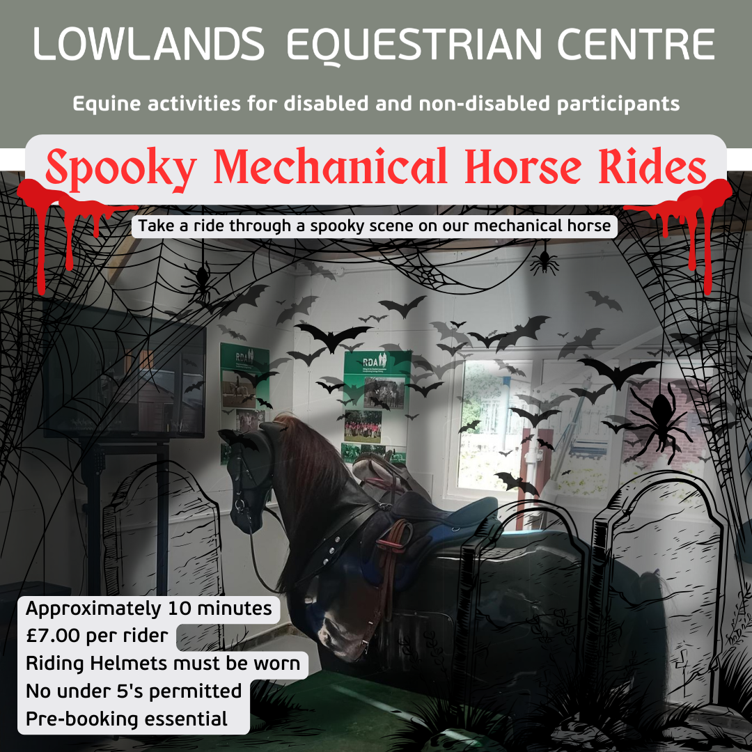 Spooky Mechanical Horse Ride - Open to all who dare, experience a 10-minute (approx.) emmersive ride through a "dark" spooky scene on our wonderful Charley (all riders will require a riding hat which we will supply) suitable for beginner riders but children must be accompanied by an adult and no riders under 5 will be permitted. £7.00 per rider